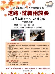 下記のように、学生向け進路・就職相談会を開催します。進路について、その選択肢や全般的な説明、就職については少し具体的な選択方法や就職活動、また活動に関わるスキルなどについて質問を受けるとともに解説します。気軽に皆さんの進路に関わる質問をお持ちください。